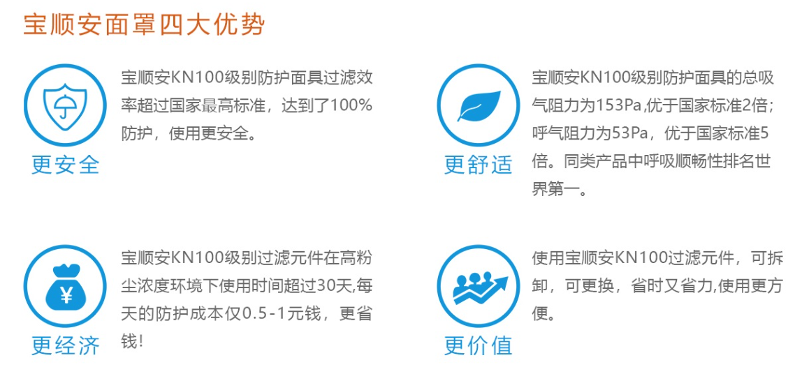 谈到防护面具,我要讲一讲我们的宝顺安KN100防尘面罩。宝顺安KN100防尘面罩执行标准GB2626-2019《呼吸防护用品 自吸过滤式防颗粒物呼吸器》。