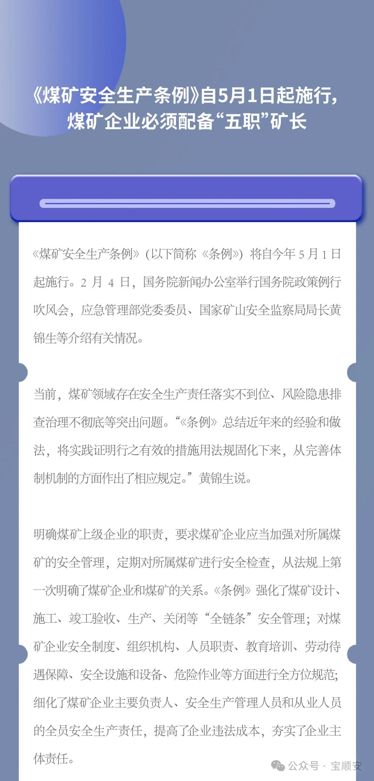 《煤矿安全生产条例》自5月1日起施行,煤矿企业必须配备“五职”矿长